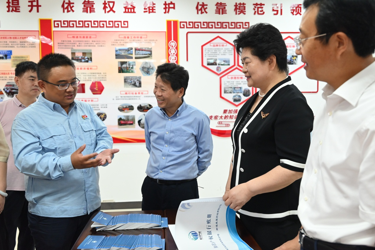 公司董事長、總經(jīng)理袁擁軍代表公司全體員工對蔡毅德一行表示熱烈的歡迎,并陪同參觀了公司黨群活動室、產(chǎn)改工作室,詳細(xì)介紹了在公司“五彩黨建”引領(lǐng)下,以“五個(gè)依靠、五心工程”為抓手開展的一系列產(chǎn)改工作。袁擁軍匯報(bào)了公司近年來在黨建工作、生產(chǎn)經(jīng)營、科技創(chuàng)新、人才培養(yǎng)、產(chǎn)業(yè)工人改革等方面取得的優(yōu)異成績。調(diào)研過程中,來訪人員饒有興趣的了解了公司 “員工幸福計(jì)劃”、“知識產(chǎn)權(quán)銀行”制度、“青藍(lán)工程”等亮點(diǎn)工作和做法,并給予高度肯定。袁擁軍向來訪人員贈送了由公司黨員和管理骨干開展讀書征文活動編撰的 “單位如家、感恩有我”、“奮斗如歌”、“責(zé)任如磐、攻堅(jiān)有我”系列叢書。